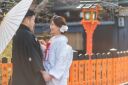 京都は四季それぞれの魅力があるロケーション 冬の景色に鮮やかな刺繍のお着物が映える一枚です