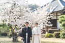 降り注ぐかのようにお二人を包み込む桜の木々が可愛さを演出した一枚です。そっと肩に添えられた手を握る新婦様もなんとも愛らしいですね。
