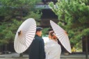 静かな空気感に包まれて 歴史を物語る建造物の前で佇むお二人 赤×白の番傘がインパクト大です!