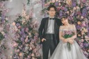 淡い紫のお花に囲まれた新婦様のソロショット。あるで本当のお花畑にいるような雰囲気に華やかなお写真となりました。