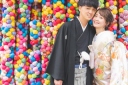リシアンスタジオの大きな特徴であるフラワーウォール前での一枚とびっきりの笑顔にスタッフもつられて笑顔に…