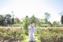 洋髪姿の白無垢と庭園の緑がとっても馴染み素敵な風景画の完成