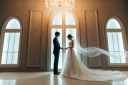 ネイビーでドレープの効いたカーテン、高級感のあるシャンデリア。まるでラグジュアリーなホテルでの撮影のよう