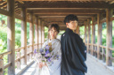白無垢の映える寺院の回廊で和装のバックショット、衣装に合わせた髪飾りとブーケの白が美しく輝きます