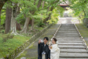古都京都らしい緑に溢れた空間、木々の合間から差し込む木漏れ日に照らされたおふたりの姿は温かみもあり柔らかな一枚に