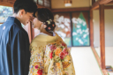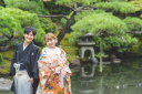 和装ロケーションフォトは東福寺にて撮影、綺麗な朱色に染められた鮮やかな愛染堂の前でふたり揃って