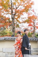 朱色の本堂と紅葉のグラデーションが鮮やかなお着物と見事にマッチした1ショット 京都らしさで溢れています