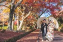 紅葉を背景に一つの番傘に一緒に入ることによってお二人の距離が近くなって恥ずかしさもありながら可愛らしいショットとなっています。