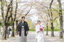 手を取り合い、お庭を眺めるお二人の向こうに見える綺麗なピンクの木がハートマークに見えてきませんか?