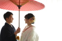 シンプルな壁の前で。和装が似合うお二人に和装らしいポーズ。