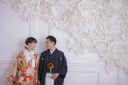 白の背景にドレスとタキシードがすごく映えます。笑顔が素敵なお二人でした。