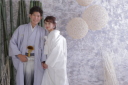 ピンクのバラの背景で、真っ白のお衣装がとても映えますね。
