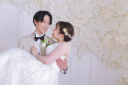 華やかなお花の背景で手を繋いでラブラブショットにキュンです!