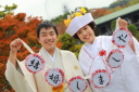 赤の背景に白無垢が映えます。紅白でおめでたさ倍増!