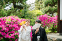 紅白の和傘がとってもよくお庭いなおふたり。素敵な笑顔をたくさんありがとうございました。