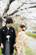 祇園の桜とも撮影。元気いっぱいの新郎様、笑顔の素敵な新婦様は桜の華やかさにも負けません。
