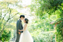 緑の木々を縁に2人を入れた一枚。さらに白のドレスが映えますね。