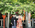 白無垢に赤い傘は、ぴったりです。この時期になると緑とのバランスも良くなります。