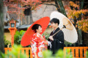 紅葉シーズンとなると、京都のロケ地はどこもすごく綺麗です。今回は円山公園へ行きました。紅く色づくロケーション、お二人の笑顔がとても可愛いです。