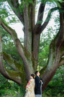 お二人だけの空間をとても大切に撮影しています。木漏れ日がキラキラと、幸せそうに笑うお二人が素敵です。