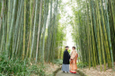 緑に赤と白の和傘はとても映えます。自然の中のお二人はとても可愛いです。