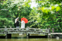 広々とした鴨川で、緑と青空が清々しいイメージを表してくれます。お二人も楽しげでいいですね。