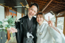 白無垢と黒紋付がとってもお似合いのお二人。緑をバックに自然な表情で。