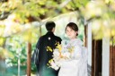 荘厳な萬福寺さんで、白無垢撮影開始。ロケーション移動中のお二人。