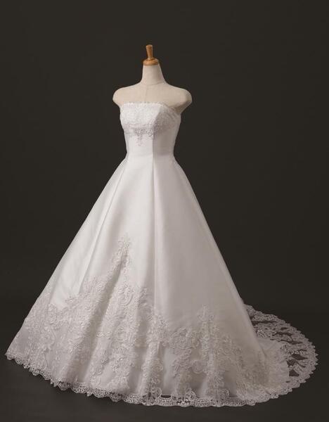 真珠のようなミカド織りの高級感、華麗なレーストレーンの上質感が、イタリア語で「女王」を意味するネーミング通り、風格すら漂うロイヤルドレス。大階段やバージンロードを歩く姿がゲストの心に深く刻まれること間違いなし。