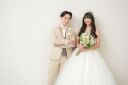 洋装のまずはシンプル背景での撮影!お二人とも最初から表情が柔らかく素敵な笑顔です!シンプルな背景はドレスのシルエットも分かりやすく、すっきり見えておすすめです!