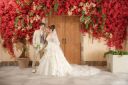 バックの鮮やかな赤いブーゲンビリアのアーチとクリーム色の花々と衣装マッチし、ロマンチックな雰囲気で演出しています。堂々とした立ち姿が美しい一枚です。
