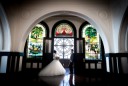 広い池と三重塔、木々の緑をバックに、色打掛のお色味と番傘の赤色が映えています