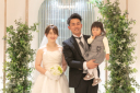 お二人の座り姿のお写真です。ナチュラルな雰囲気のチャペルに彩が加わります。