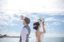 沖縄の海をバックにパシャリ★新婦様はヘアチェンジをされてダウンスタイルに♪