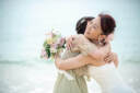 チャペル撮影が終わったらビーチへ移動!空と海が一体化したかのような青々とした中、ブーケを使ったお洒落な一枚をパシャリ♪