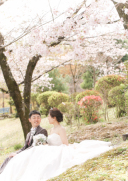 満開の八重桜と新緑が入る場所で後ろ姿を♪お2人の雰囲気もよくとっても素敵なお写真になりました!
