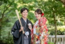 東屋でのワンシーンです。たくさんの緑が生い茂っていて、赤い色打掛がよく映えます◎