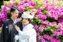 ツツジが咲く道でお散歩風のショットを撮りました!相合傘で仲良しな雰囲気がより引き立ちます♡
