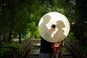 撮影には欠かせない番傘のお写真です。紫と赤がお着物を引き立てます。