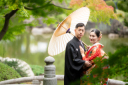 当店でご用意している、番傘を使用して撮影!お好きな撮影小物を使用できます。頬を寄せ合って笑顔のおふたりがとてもかわいらしいです♪