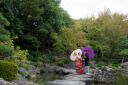 新緑の撮影!池や緑の中での撮影は特に明るく見えます。番傘でさらに和装らしさをプラス。