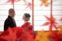 この表情は女優並み、松と門と番傘、庭園という魅力にマッチする新婦様がとても綺麗です。