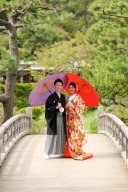 三溪園にある大きな橋で番傘を持ちながら撮っていきました