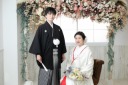 白から色打掛に衣装替えをしてスタジオで。お二人の優しい雰囲気がスタジオのセットにぴったりですね。