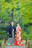 季節によって三重塔も見え方が違っています。三溪園ならではのお写真です。お二人の笑顔も爽やかに!