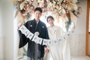二人ともお色直しをして雰囲気をチェンジ。バイカラー背景の中心で撮るとおしゃれな印象に。