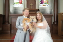 ステンドグラスを背景におふたりの撮影です。背景のステンドグラスがとてもキレイです!