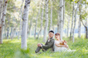 白樺の森で手を握り見つめ合うおふたり。白樺のグリーンに洋装が映えます!