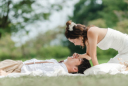 最初にみんなで建てたテントの前で、リラックスした様子で空を見上げるお2人。お二人の「好き」から生まれたオリジナルです。