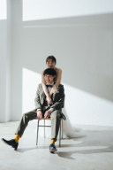 和装から洋装へとお着替えをして撮影です。素敵なドレスとタキシード、とてもお似合いです。